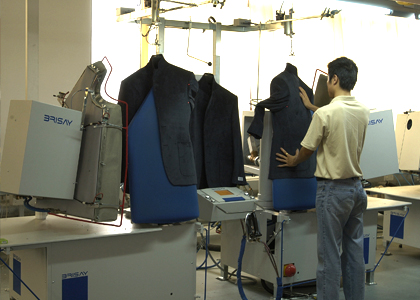 運(yùn)用高品質(zhì)的德國(guó)BRISAY立模整燙機(jī),采用電腦控制蒸汽輸出量、溫度、壓力、定型、抽濕時(shí)間,根據(jù)面料的厚薄、質(zhì)地、性能,以38種不同整燙程序調(diào)整以上各個(gè)參數(shù),配合服裝的整燙。